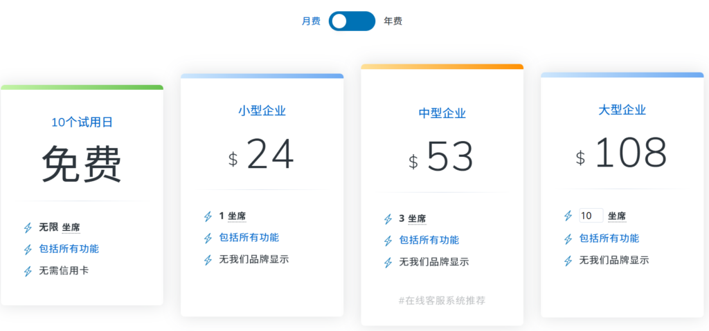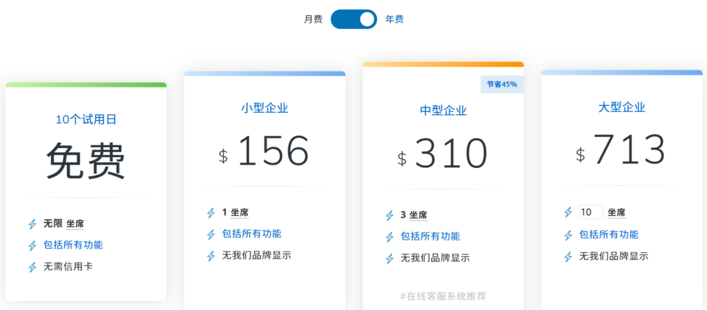按坐席收费,仅需选择您需要的操作员的人数,其他功能都是在线客服系统不会限制的,分为月付和年付,24美元/月/坐席,多买多优惠,我们很荣幸为我们客户提供最佳的体验。